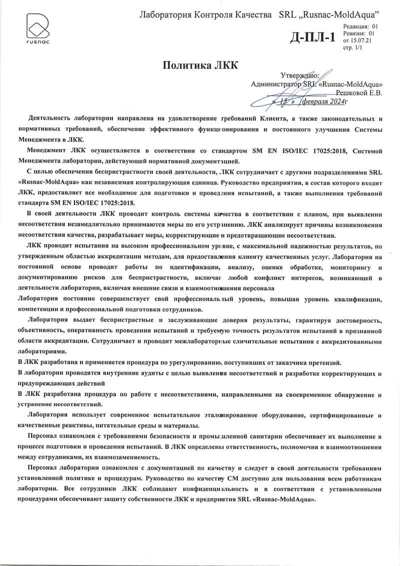 Лаборатория контроля качества SRL “Rusnac-MoldAqua” (1)